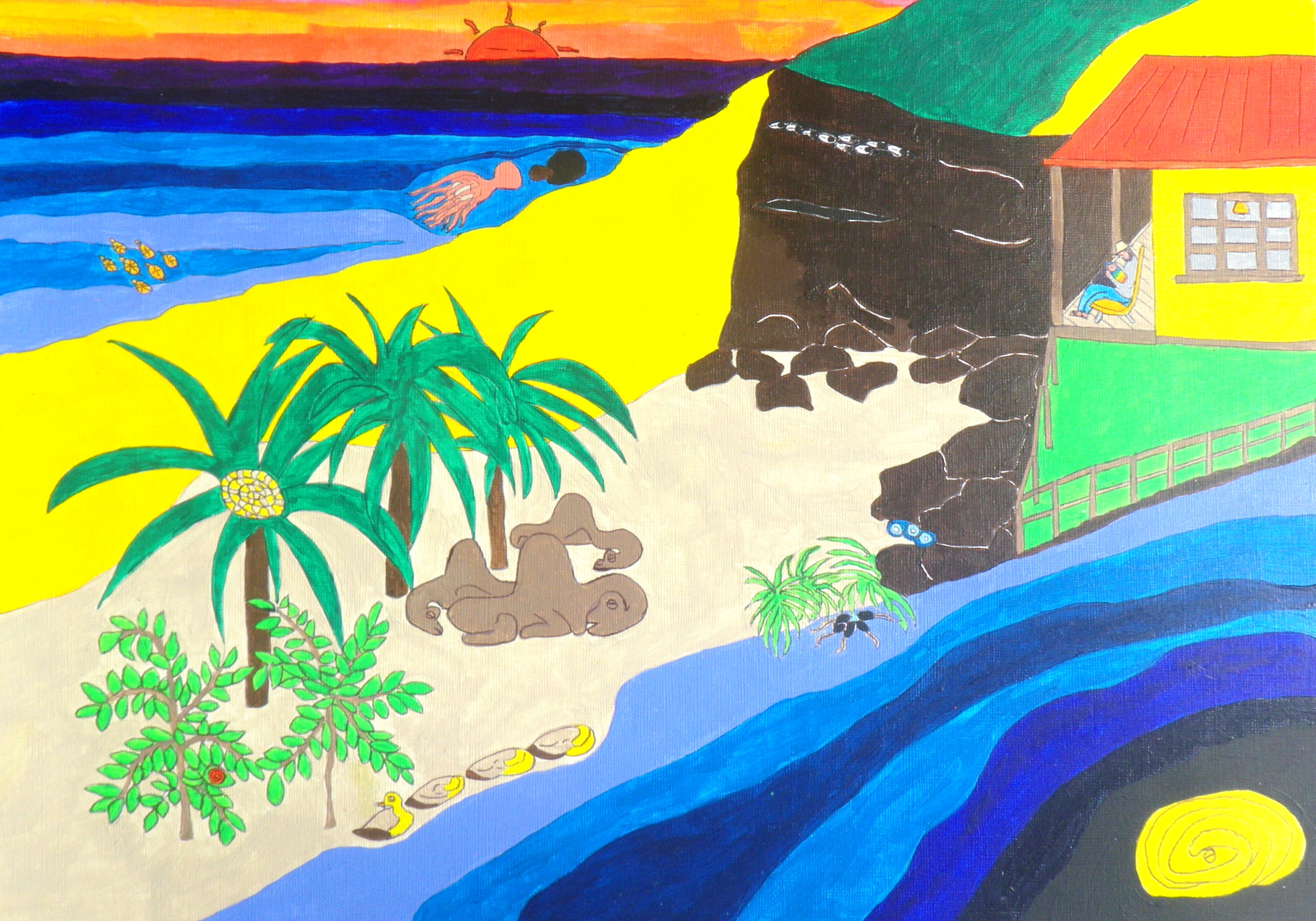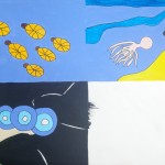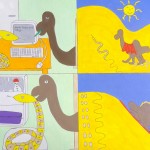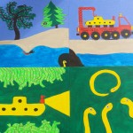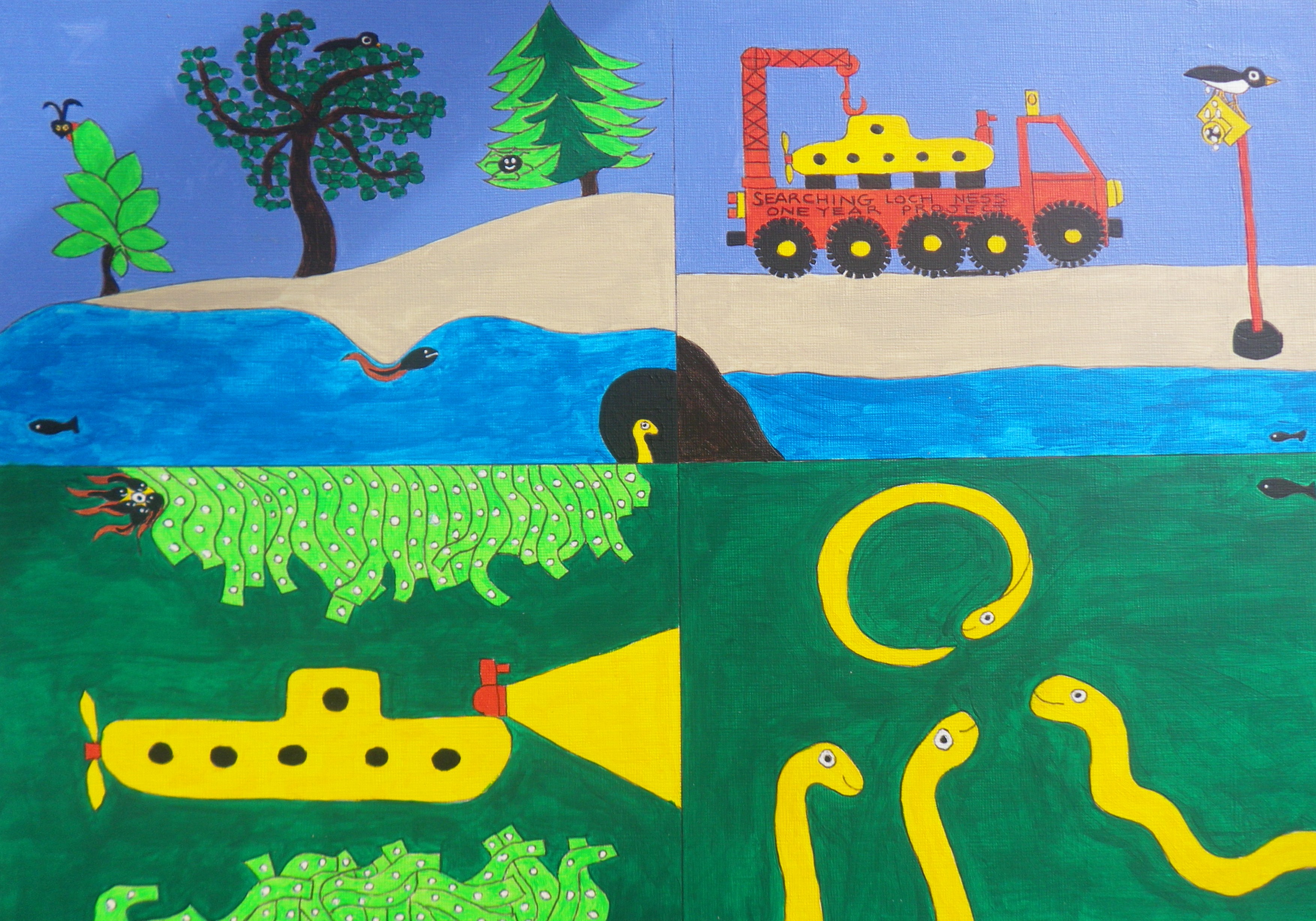 hide and seek, lorry and camera, submarine underwater and Moja’s loop the loop. acrylic/pen original, A3, NOT FOR SALE